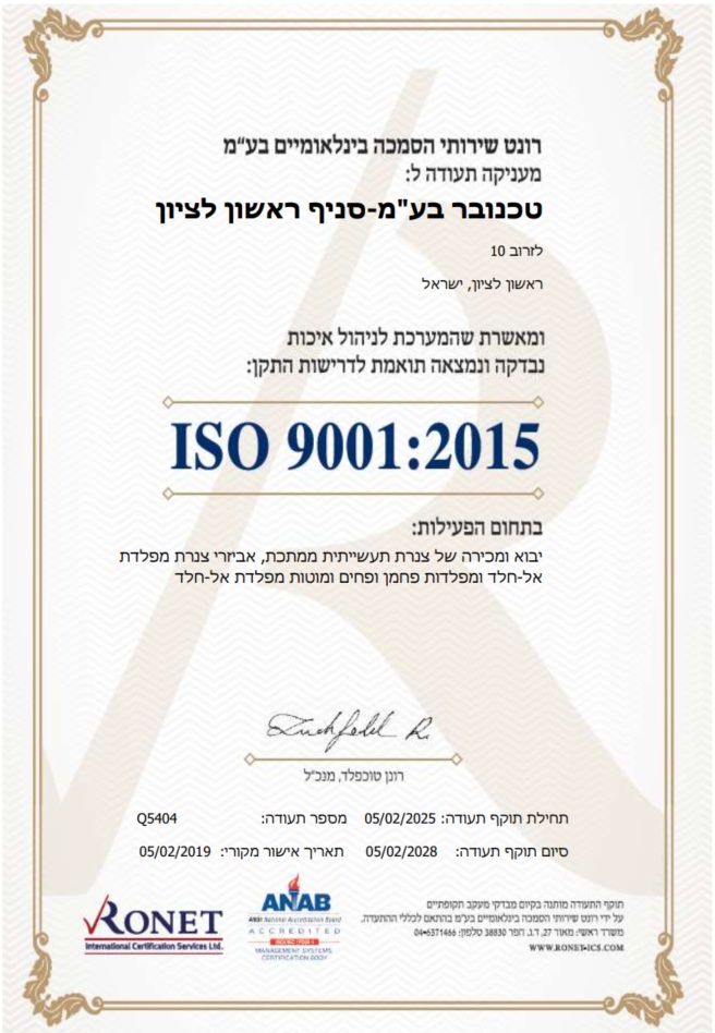 לחברת טכנובר בע"מ הסמכה לתקן ISO:9001 והיא מנהלת מערך הבטחת איכות מקיף, האחראי לייסד ביטחון במוצרי החברה בקרב לקוחותיה. קיום מערך הבטחת האיכות, נועד להבטיח את רמת איכות המוצרים בארגון כולל תהליכי האחסון, בדיקת סימונים ואישור תעודות האיכות.